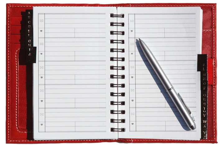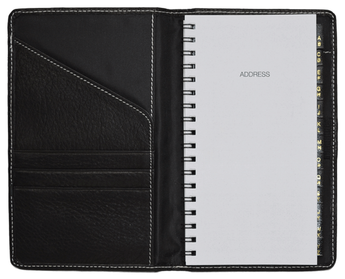 Address Book Insert Wire-bound address book includes 13 division tabs and 26 sheets. Tabs are made from leatherette. Black leather cover is not included. See below how to purchase this leather pocket calendar cover.